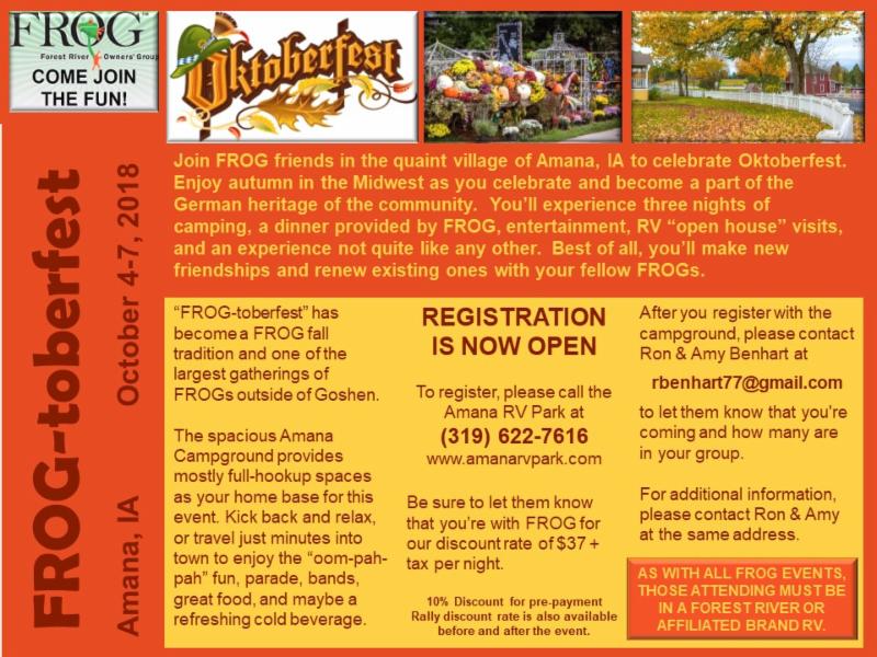 Join FROG and hosts Ron and Amy Benhart in Amana, Iowa for in the spendor of a Midwest autumn. The Oktoberfest German festival in the historic and charming Amana Colonies is always great fun. "FROG-toberfest" is entering its 5th year, and makes it even more special when you share it with FROG friends! You'll enjoy three nights of camping (most sites are FHU), a catered dinner, live entertainment, campfires and more!